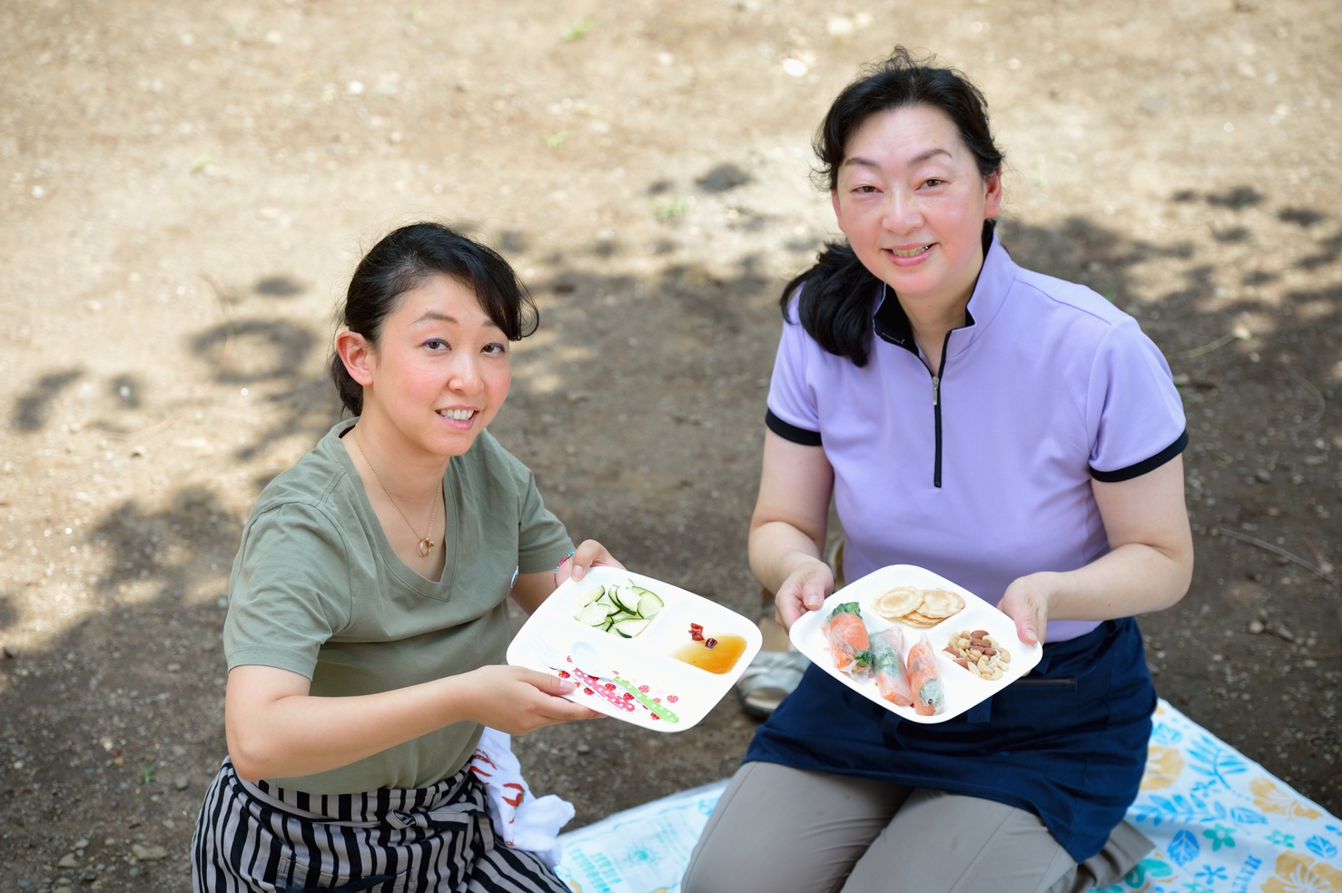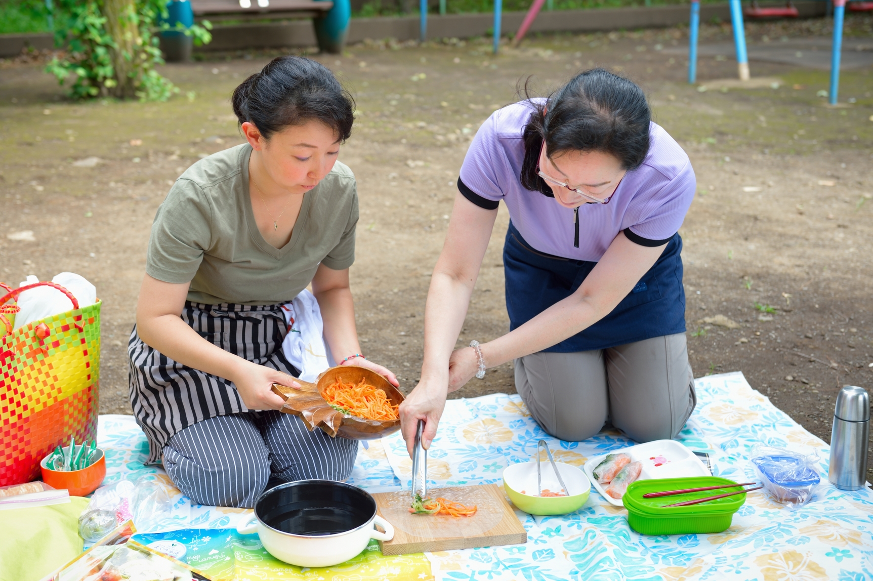 アウトドア料理は、まるで大人のおままごと。今日は撮影のため、NPO法人HOTNETキッチン代表理事の石田美弥子さん(写真右)とともに、近所の公園でアウトドア料理を実演。