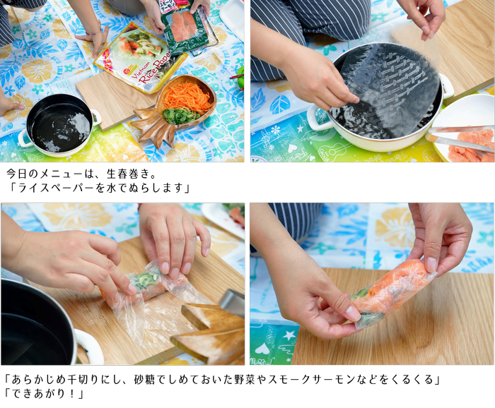また最近は、災害時をテーマにしたメニュー開発も手がけているので、缶詰や乾物を使うことも。たとえば生春巻きなら、火がなくても作れるので、災害時で火が使えないときにも便利なメニュー。具材を用意して巻くだけだから、料理が苦手な人でも、みんなで作ってみんなで食べるということが気軽にできますし。